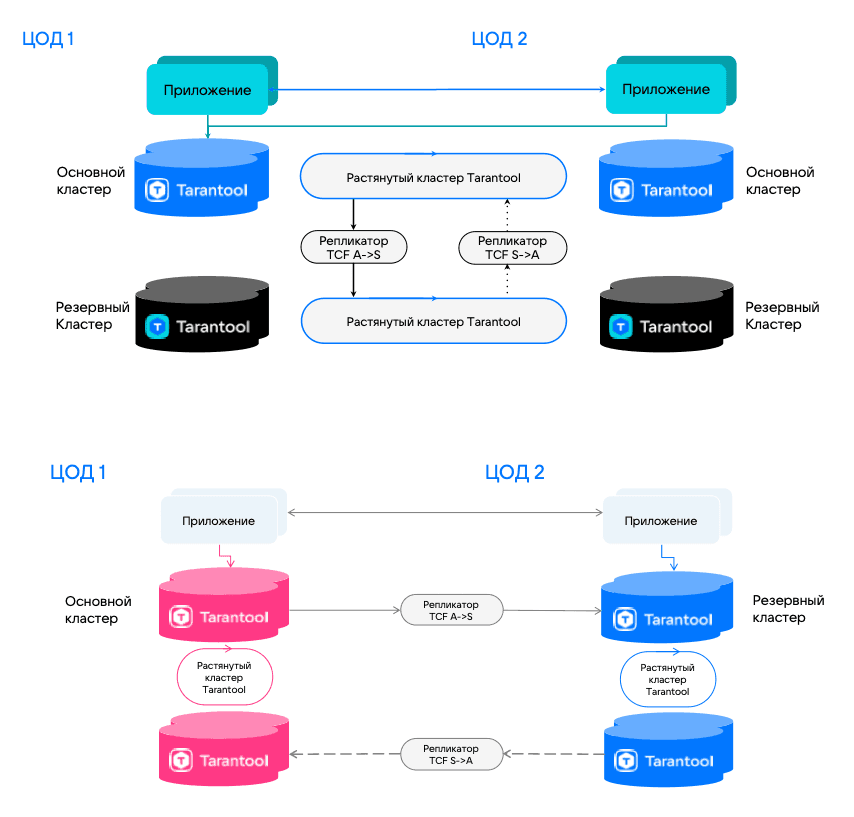 Система Tarantool поддерживает создание растянутых кластеров, которые могут быть распределены между несколькими центрами обработки данных (ЦОДами). В каждом ЦОДе располагаются по одному и двум узлам Tarantool на каждый репликасет (сегмент). Синхронизация данных между ними обеспечивает надёжность и устойчивость к сбоям. Обновление системы проводится по плечам: сначала в одном ЦОДе, затем в другом, что снижает вероятность полной потери данных или простоя системы.