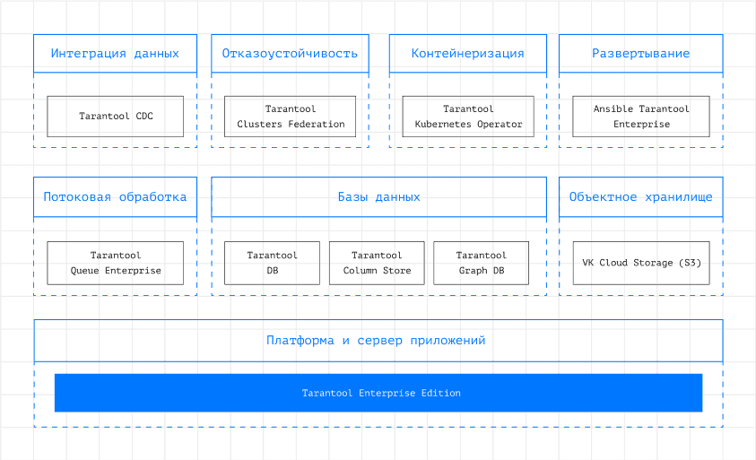 При этом разработана Tarantool Enterprise Edition - платная, корпоративная версия платформы. Именно на ее базе создана целая экосистема «коробочных» Enterprise-продуктов, доступных только в платном формате. Они закрывают ключевые потребности бизнеса, связанные с: